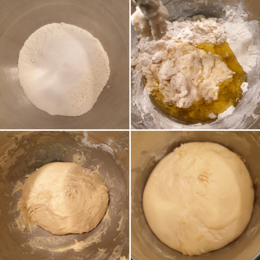 2. Dans le bol du robot équipé de son crochet mélanger la farine, le sucre et le sel. Compléter avec le lait avec la levure, l’huile d’olive mais aussi l’eau de fleur d’oranger et le sucre à chouquette si vous avez choisi ces options. Pétrir durant 10 minutes à vitesse moyenne.