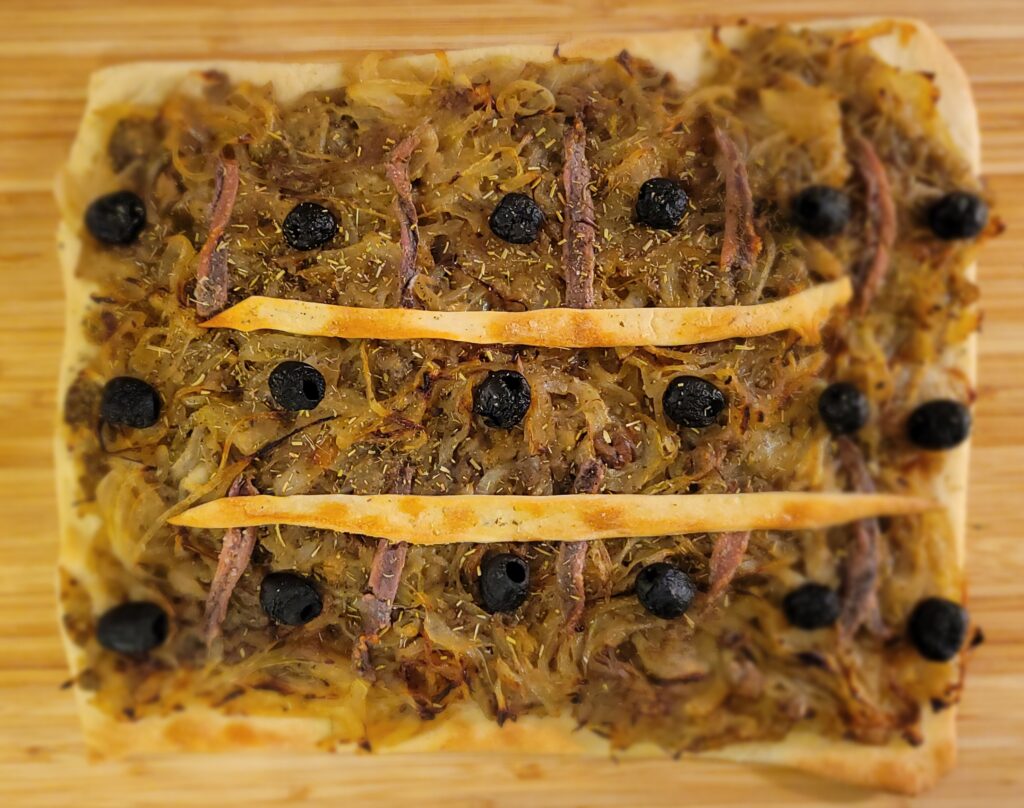 4. Étaler la pâte et la disposer sur une plaque recouverte d’une feuille de cuisson. Disposer la garniture aubergines-oignons dessus puis répartir les filets d’anchois, les olives, parsemer de thym et enfourner à 220 degrés pour 15 minutes en surveillant.